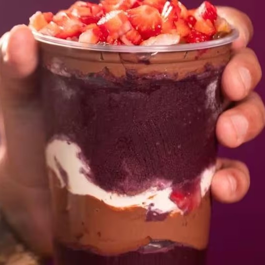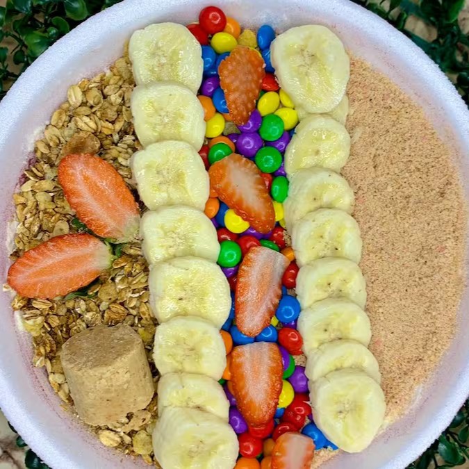 Montagem : açaí + complementos grátis + cupuaçu + complementos grátis + açai finalizado com 4 complementos grátis selecionados pelo cliente + 3 opção de frutas a sua escolha + 1 calda de sua preferência