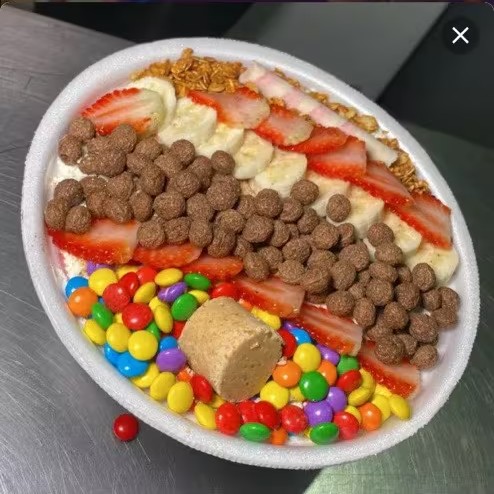 Acompanha: aproximadamente 1000lt, açai, leite em pó, granola, xerem, morango, banana e muita nutela + leite condensado