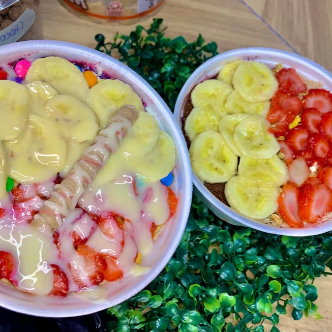 Aproximadamente 300ml em cada da nossa delicia de açai com 3 complementos + 2 deliciosas frutas e uma calda de sua preferencia