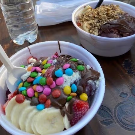 Metade açai e metade sorvete de sua escolha com aproximadamento 300gramas de açai com sorvete + 3 complementos a sua escolha + 2 fruta e 1 calda de sua preferencia