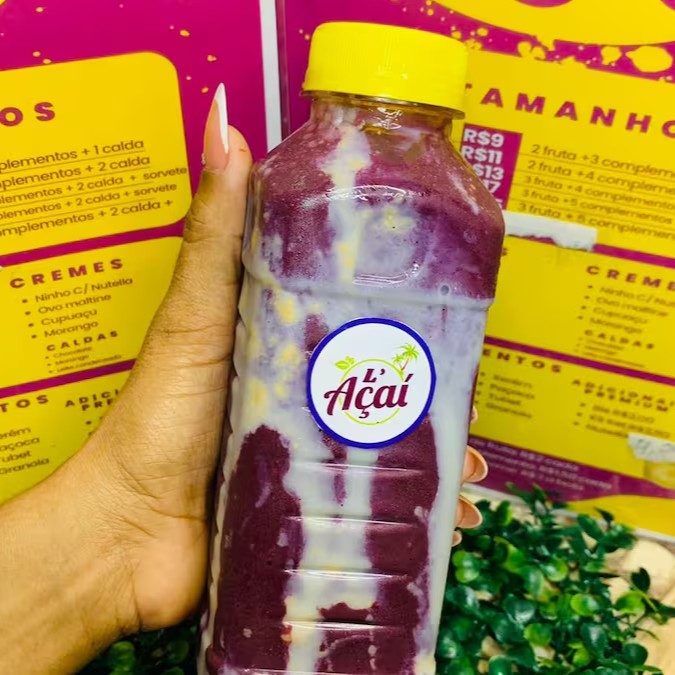 Açai batido na garrafa com açai e leite e finalizado com a sua calda preferida