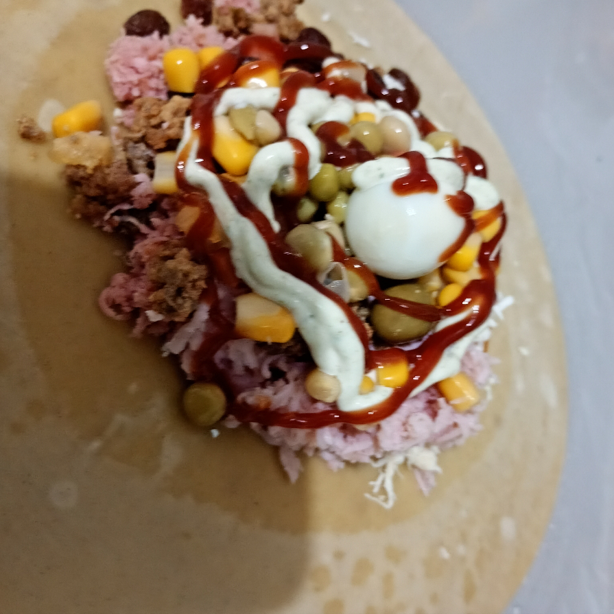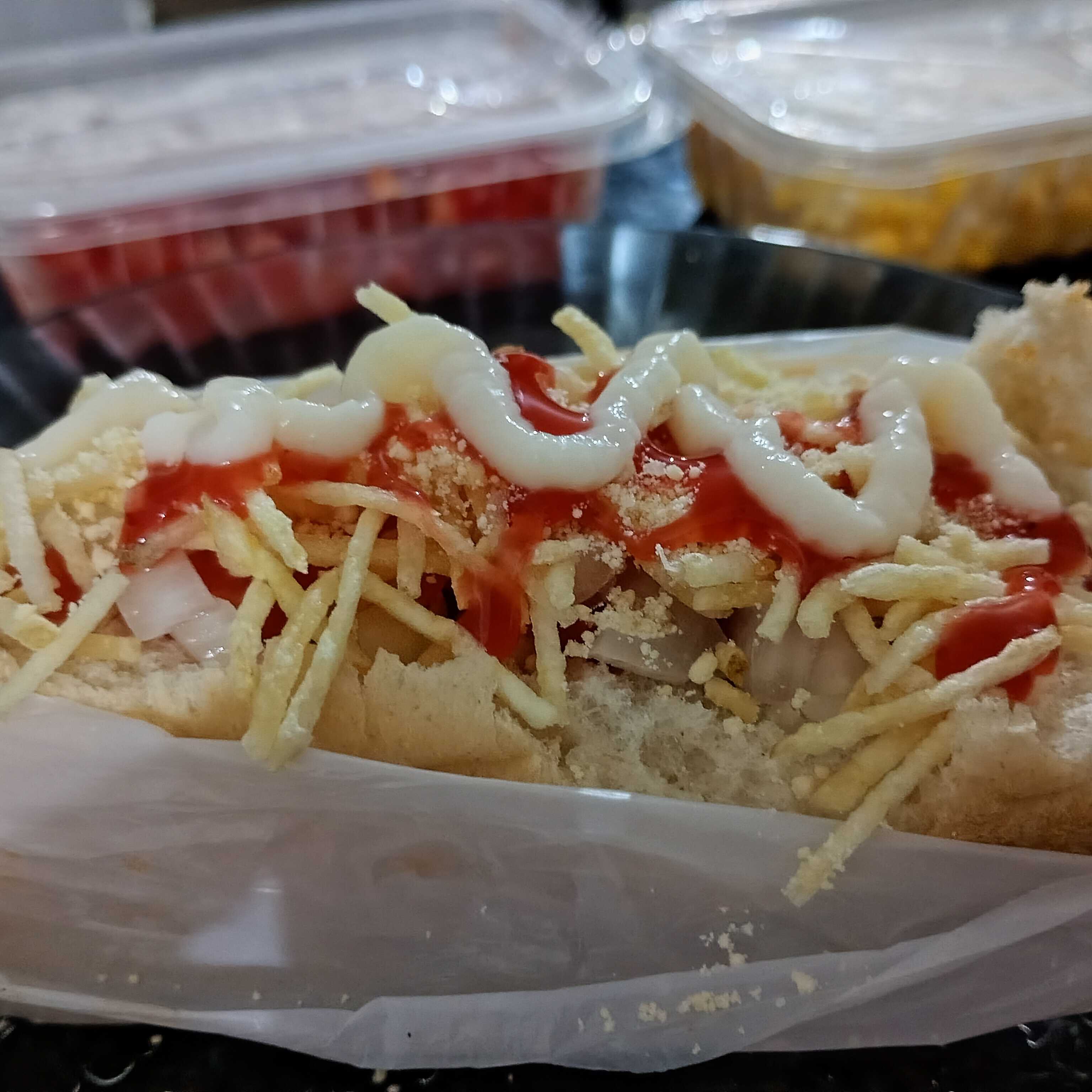 30 cm ,2 salsichas ,tomate e cebola ,milho e ervilha batata palha molho da casa