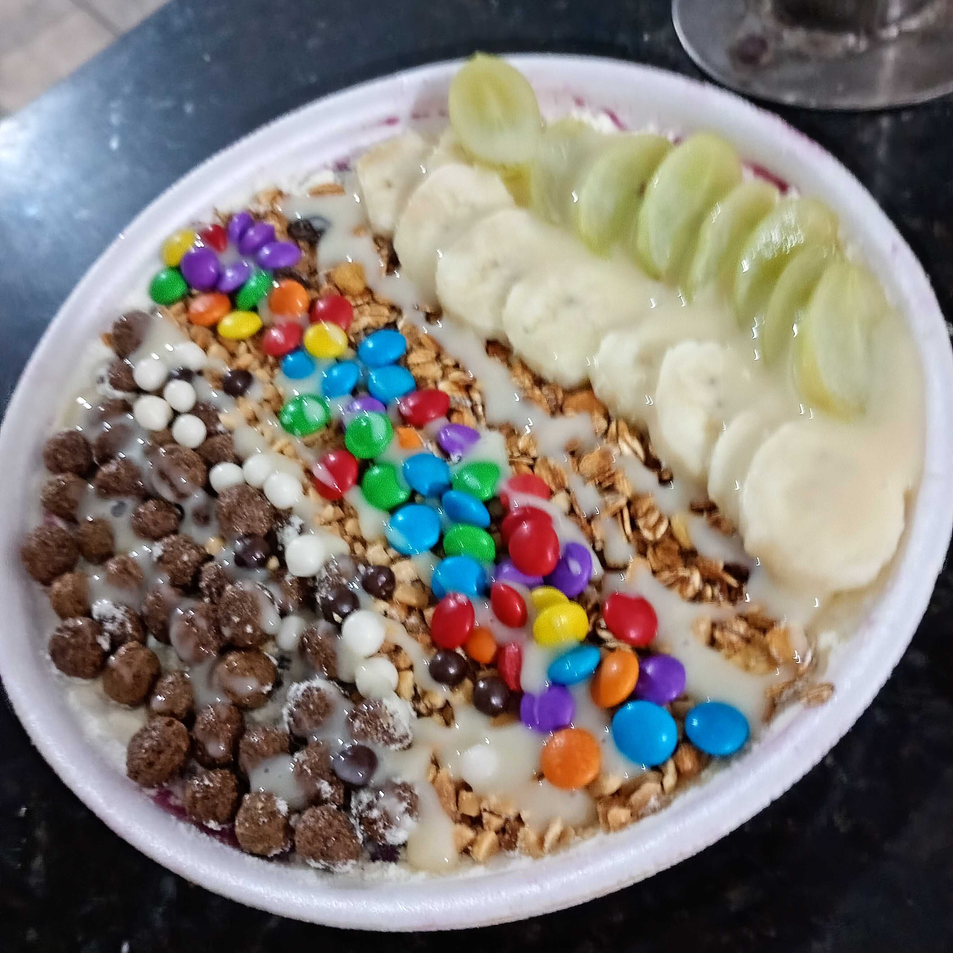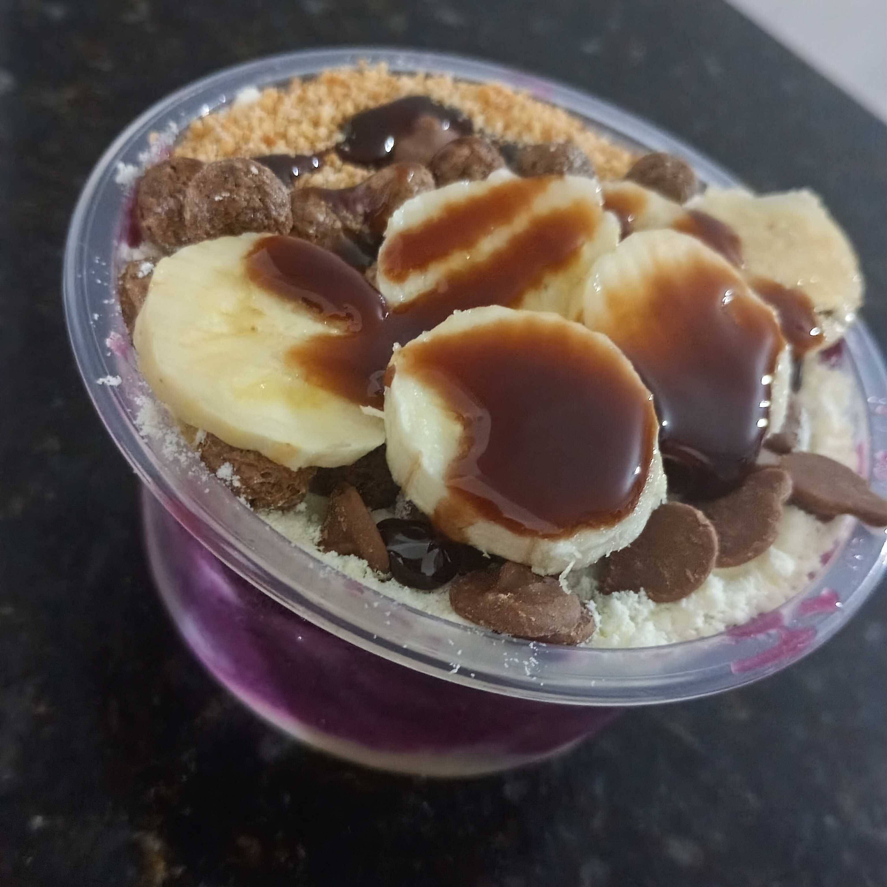 aproximadamente 500 ml de açaí super cremoso , 4 acompanhamento 1 calda e 1 fruta