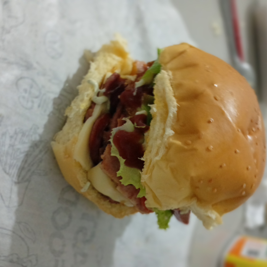 um delicioso hambúrguer industrial,ovo ,calabresa molho da casa completo