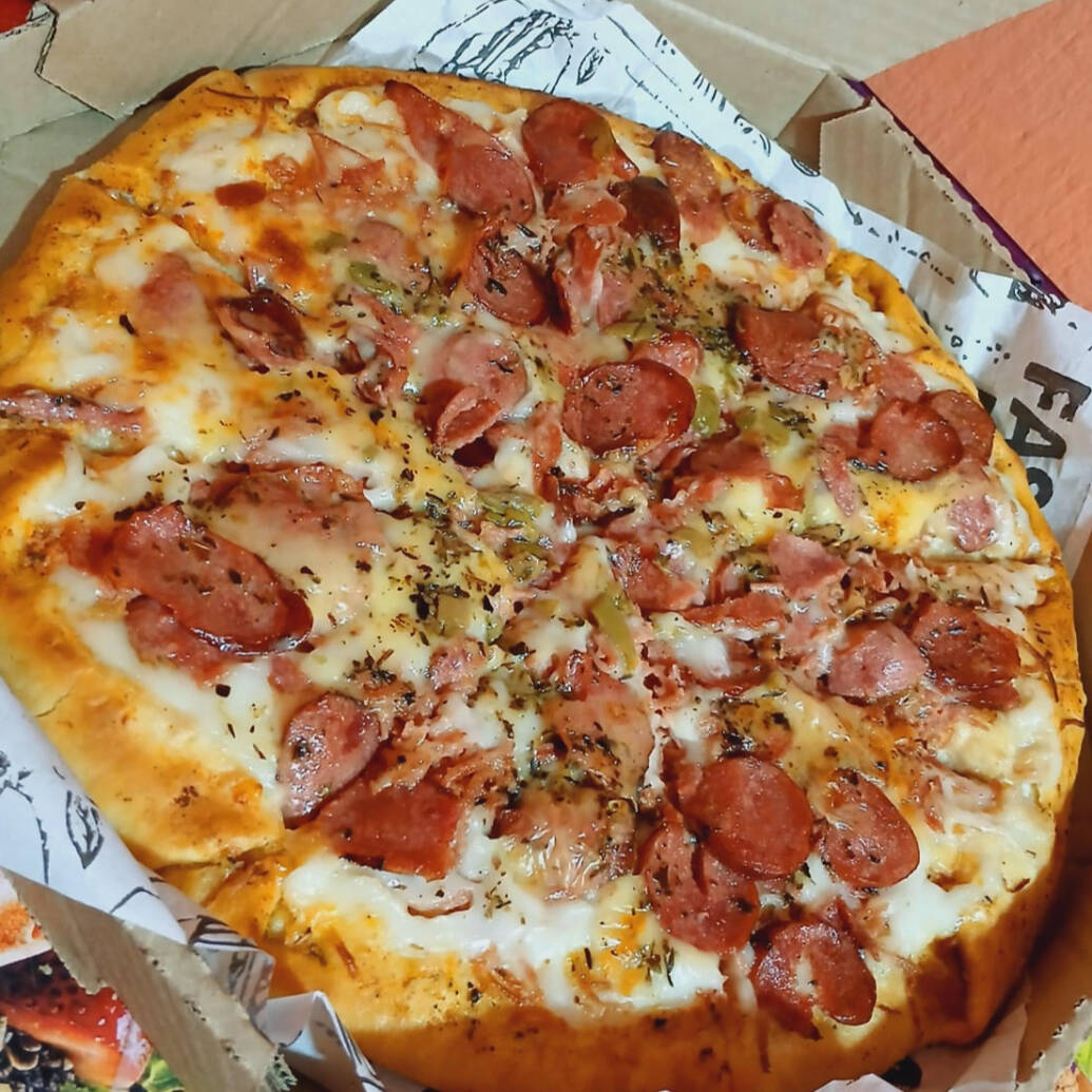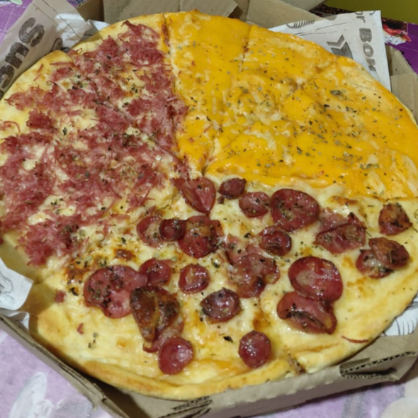 Massa Artesanal da casa, molho especial, queijo mussarela, calabresa, Catupiry, cheddar, orégano.