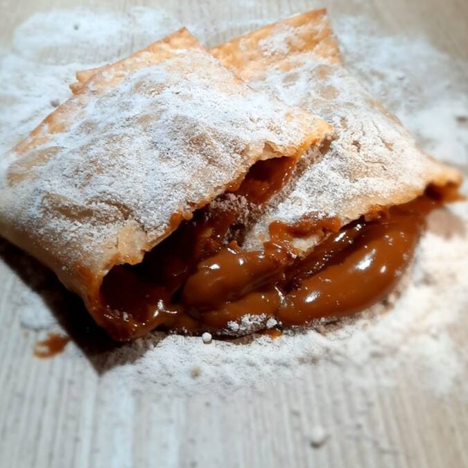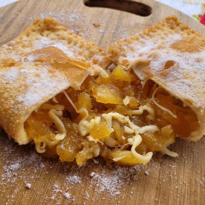 Um doce de abacaxi caramelizado com mussarela e um leve toque de açúcar com canela polvilhado por fora do pastel!!