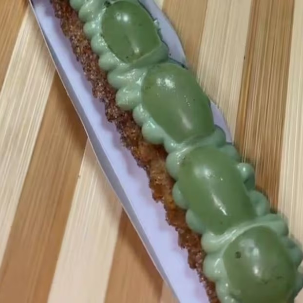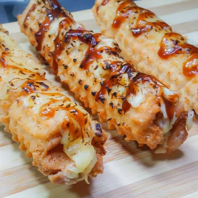 Base de cream cheese, calabresa e queijo em cima maçaricado.