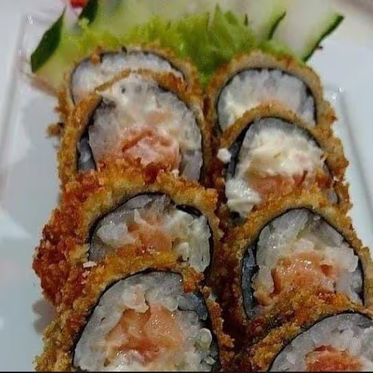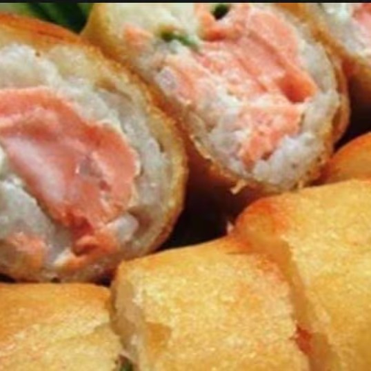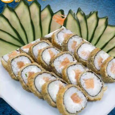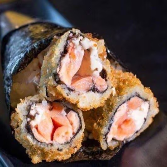 Sushi frito na massa de harumaki, com recheio de salmão e cream cheese, gergelim e cebolinha. (11 unidades)