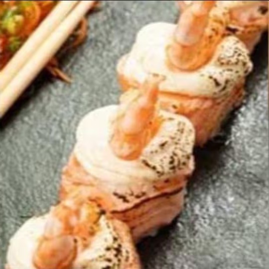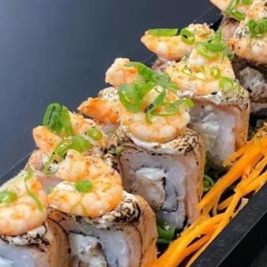 Lâmina de salmão maçaricado, envolto do arroz, cream cheese, camarão empanado por dentro e camarão natural por cima, gergelim e cebolinha