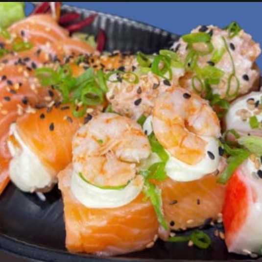 Manta de salmão natural ou maçaricado, cubos de salmão natural, camarões empanados, arroz japonês, cream cheese, cebolinha e gergelim.