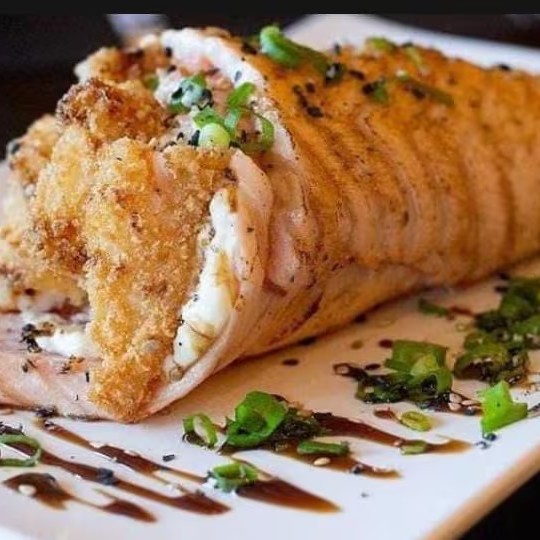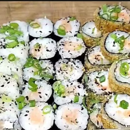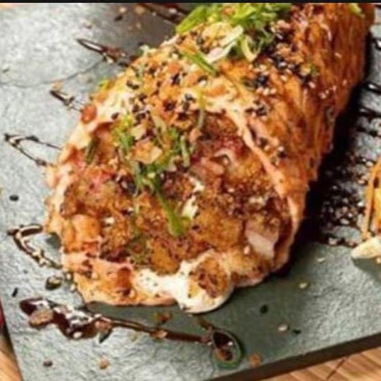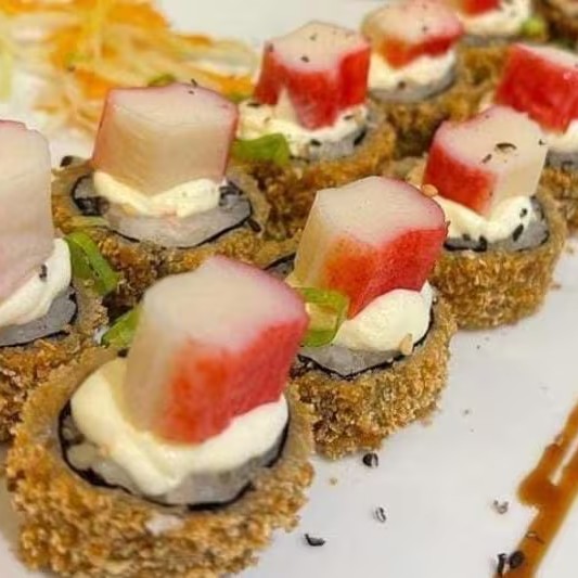 Manta de salmão natural ou maçaricado, camarões empanados, arroz japonês, cream cheese, cebolinha e gergelim.