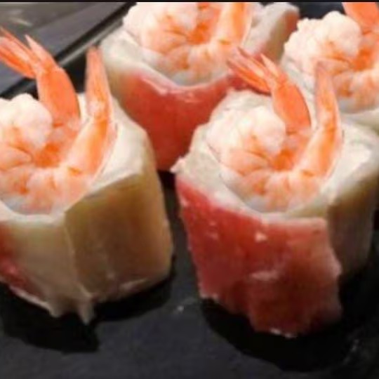 Rolinhas de carioca de camarãozinho sobreposição de cream cheese e camarão natural, gergelim e cebolinha