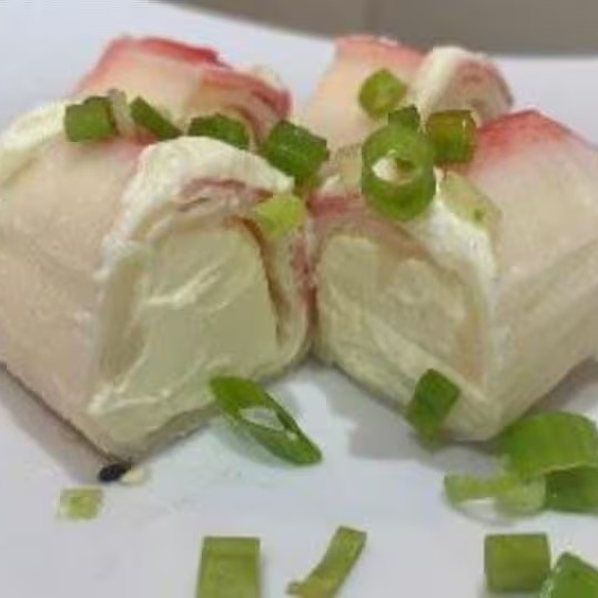 Kani envolto com cream cheese, sobrepondo com camarão natural, gergelim e cebolinha.