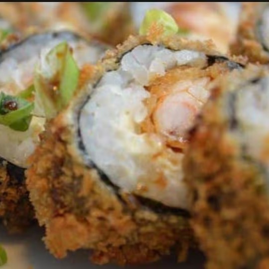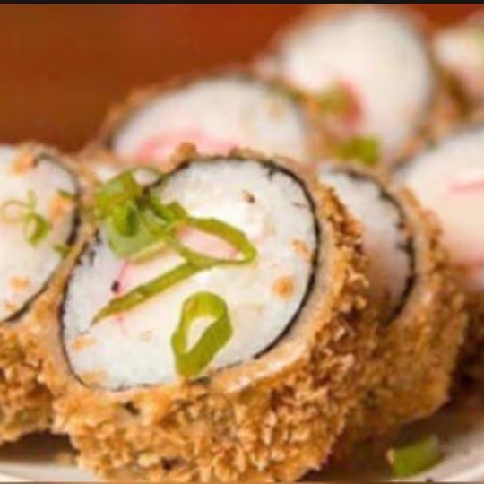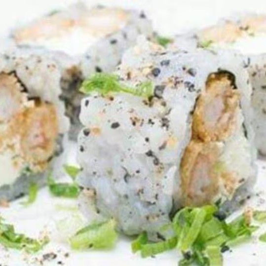 Camarão empanado, cream cheese, arroz japonês, cebolinha e gergelim.
