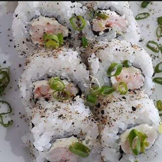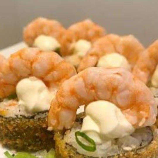 Camarão natural, cream cheese, arroz japonês, cebolinha e gergelim.