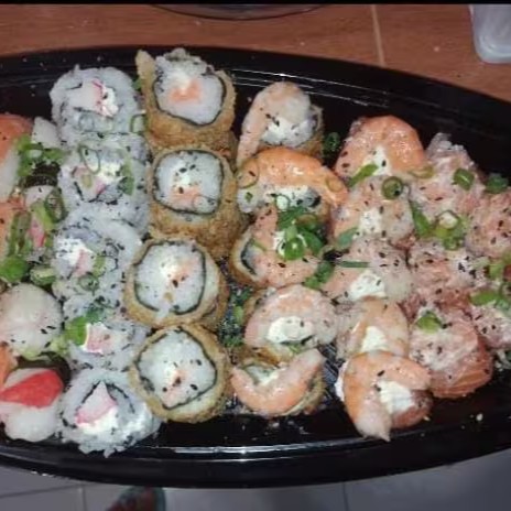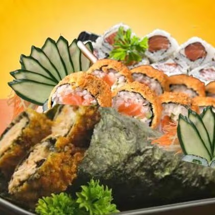 10 uramakis de skin (somente hoje está saindo com 10 uramakis de salmão) 10 cariocas de salmão 10 hossomakis de kaniacompanha molho shoyu e teryaki