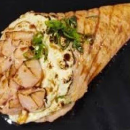 O 'Kani Keijo', da nossa categoria de 'Sushis Especiais', é uma verdadeira experiência gastronômica. Este vibrante prato é composto por Kani primorosamente envolto em uma luxuosa camada de cream cheese, finamente salpicado com gergelim torrado e delicadamente finalizado com um toque de cebolinha fresca. Para aprimorar ainda mais a experiência, acompanha dois molhos shoyu em sachê e um copinho de molho teriyaki ou dois sachês de teriyaki, dependendo da disponibilidade. Nosso sushi especial é uma deliciosa combinação de sabores e texturas, perfeita para os amantes da cozinha oriental.