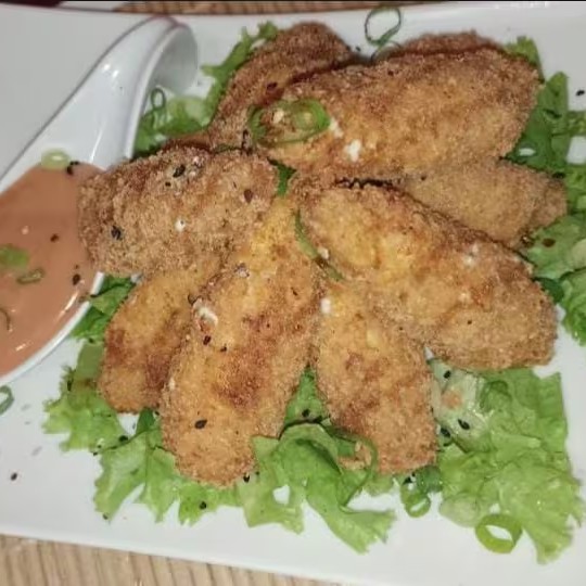 Camarão temperado, recheado com cream cheese, empanado e frito