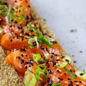 Lâmina de salmão, macaricadas ou naturais, envolto no arroz, patê de salmão, cream cheese, cebolinha e gergelim. (8 unidades)