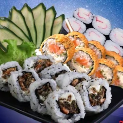 Este combinado de 20 peças é uma verdadeira viagem culinária ao Japão. Oferece 5 deliciosos cariocas de salmão, perfeitamente enrolados e cheios de sabor. Desfrute também de 5 uramakis de skin, preparados com precisão e atenção aos detalhes. Acrescentamos 5 hossomakis de Kani, um deleite para o paladar. Para completar, 2 joy-joys deliciosamente cremosos e 3 niguiris de salmão fresco e suculento. Acompanha 2 sachês de molho shoyu, ideais para acentuar os sabores, e 1 copinho de molho teriyaki ou 2 sachês de teriyaki, conforme a disponibilidade, adicionando um toque doce e salgado que fará deste prato uma experiência inesquecível.