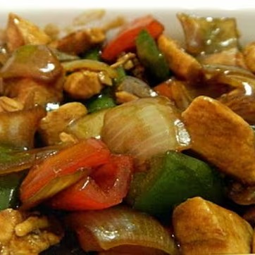 Para 2 pessoas. Legumes:cenoura,pimentão.cebola,frango,molho de soja.acompanha arroz branco e batata frita