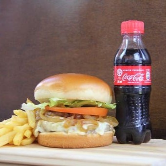 Pão bola , blend 120 gramas , 1 fatia queijo mussarela , bacon fatiado , molho da casa , barbecue , creme cheddar , tomate , cebola , alface . Batata frita (p) Coca cola gelada