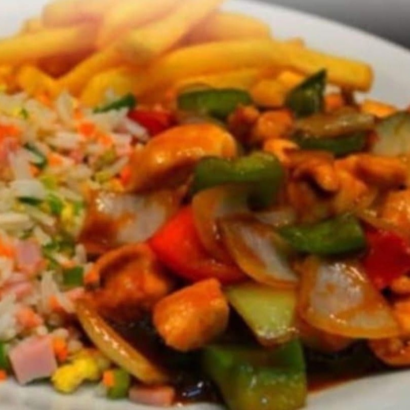 Esse prato saboroso vem com Pedaços de frango, com pimentão e cebola ao molho shoyo porção de arroz._ _#shoyo#molho#yakisoba#frango#arroz#xadrez#facil#rapido#pimentao#cebola