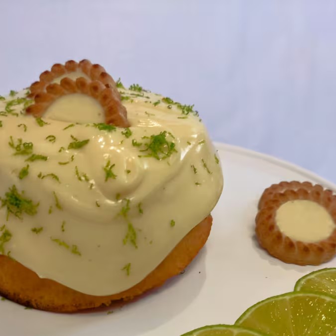Massa branca feita com iogurte natural, recheado com mousse de leite Ninho, coberto com brigadeiro cremoso sabor limão, decorado com raspa de limão e biscoito tortinha de limão. Aprox. 200g. Server até 2 Fatias.