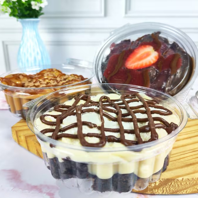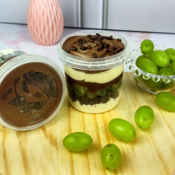 Aprox. 200g. Nosso pote é composto por uma musse de leite Ninho, com pedacinhos do nosso brownie especial, intercalado com uvas frescas, creme de chocolate blend cremoso e para finalizar, uma leve mousse de chocolate 50% cacau e granulado.
