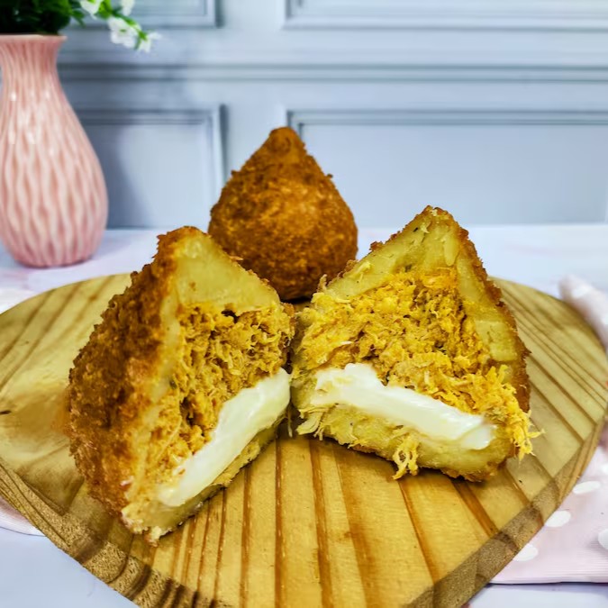 Aprox. 160g. Coxinha com massa de batata com uma super crocância, pois é empando com a farinha panko, um delicioso recheio cremoso de frango com Catupiry.