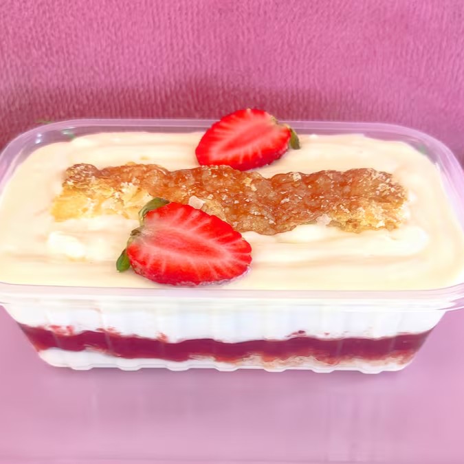 Mousse de 4 leites, biscoito folhado, geleia artesanal de morango, creme de leite Ninho, decorado com biscoito folhado e morangos frescos. Aprox. 250g