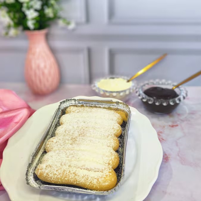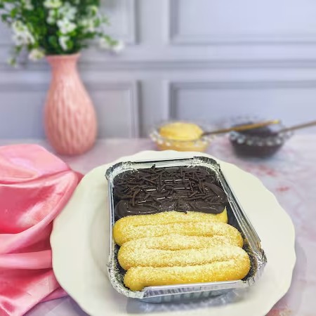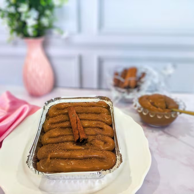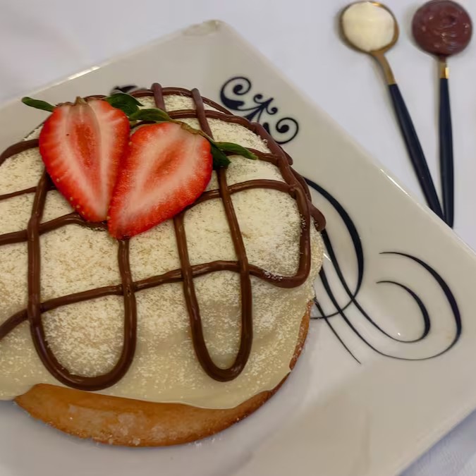 Aprox. 200g. Massa branca feita com iogurte natural, coberto com brigadeiro cremoso de doce de leite, polvilhado com canela e açúcar.