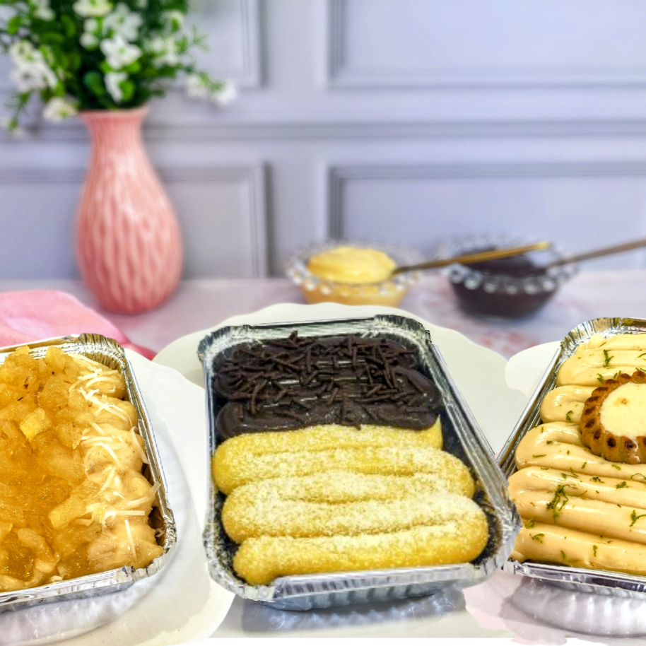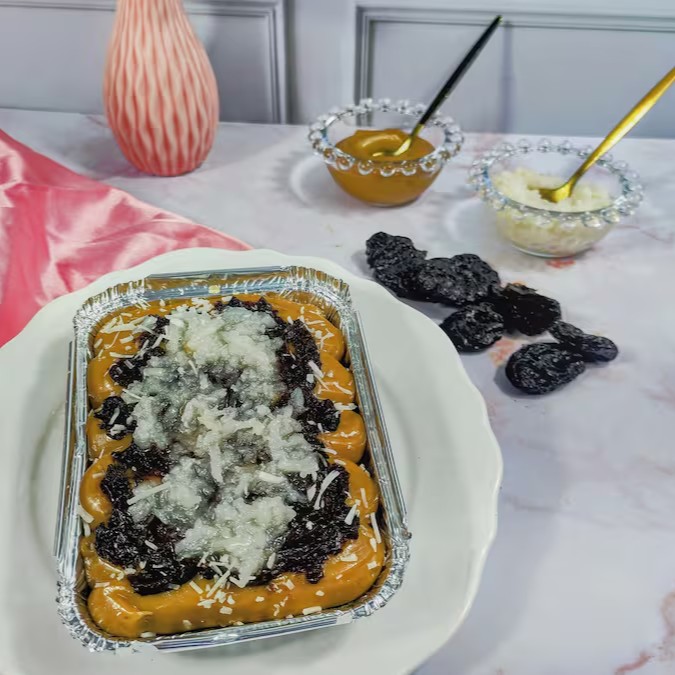 Aprox. 200g. Massa branca feita com iogurte natural, coberto com brigadeiro cremoso de doce de leite, doce de ameixa e cocada cremosa.