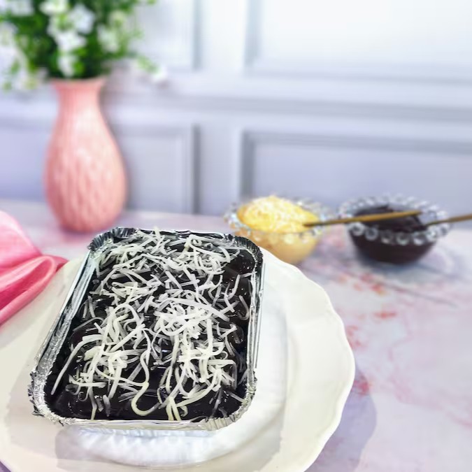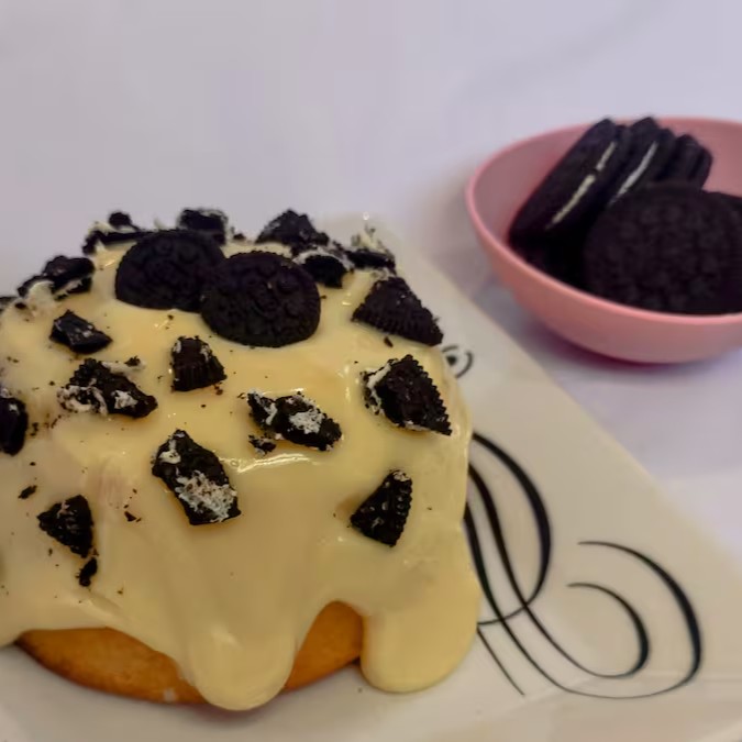 Massa branca feita com iogurte natural, recheado com mousse de leite Ninho, coberto com brigadeiro branco cremoso, decorado com biscoitos Oreo's. Aprox. 200g. Server até 2 Fatias.