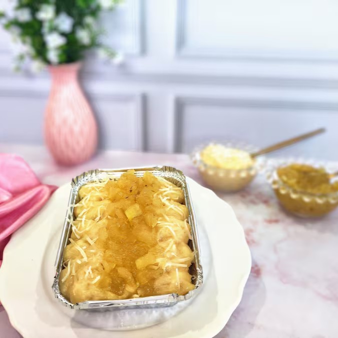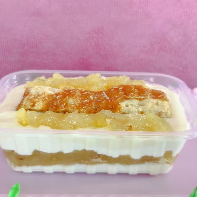 Mousse de 4 leites, creme de leite Ninho, biscoito folhado e abacaxi caramelizado. Aprox. 250g