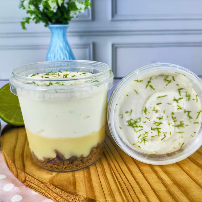 Aprox. 200g. Nosso pote é composto por uma farofa de biscoito super crocante, brigadeiro branco cremoso, nosso delicioso creme de limão e finalizado com musse, raspas de limão e um biscoito tortinha. Aprox. 200g