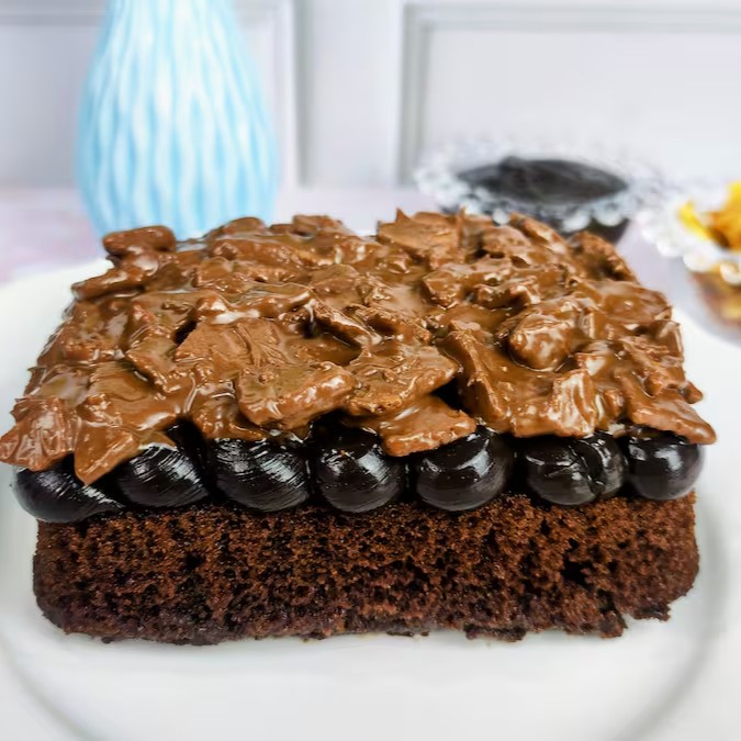 Coberta com brigadeiro cremoso. Decorado com musse de chocolate, granulado ao leite e pedacinhos de brownie.
