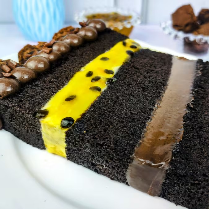 Recheado com uma camada de brigadeiro blend cremoso e outra camada de brigadeiro cremoso de maracujá.