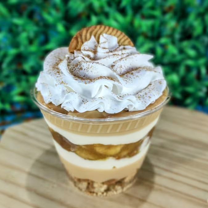 Pedaços de biscoito maltado, creme de leite Ninho, banana caramelizada, creme de doce de leite, decorado com chantininho e biscoito maldado. Aprox. 250g