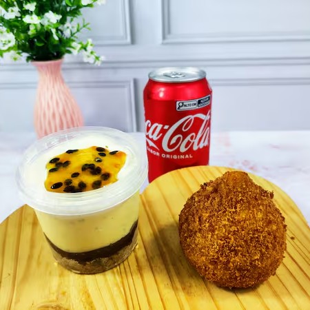 Um bolo gelado + Salgado + Coca Cola 350ml