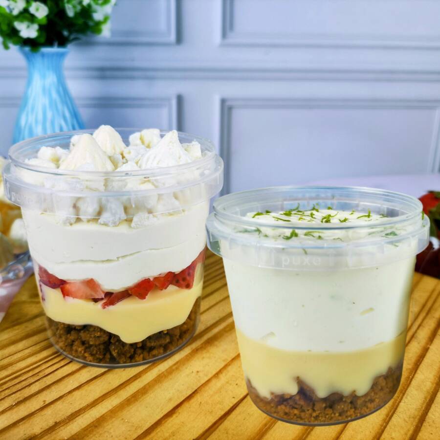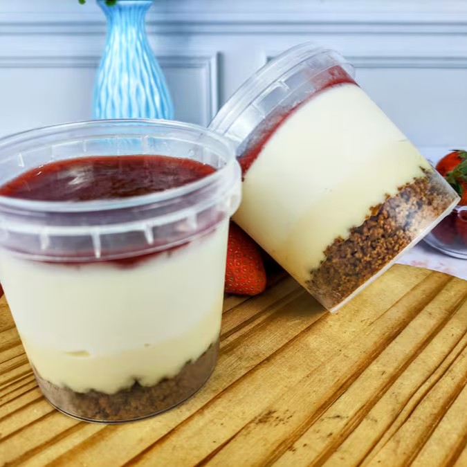 Aprox. 200g. Nosso pote é composto por uma farofa super crocante. Brigadeiro branco cremoso, nosso delicioso creme cheesecake, finalizado com nossa geleia artesanal de morango.
