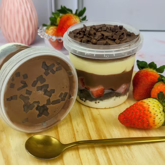 Aprox. 200g. Nosso pote é composto por uma musse de leite Ninho, com pedacinhos do nosso brownie especial, intercalado com morangos frescos, creme de chocolate blend cremoso e para finalizar, uma leve mousse de chocolate 50% cacau e granulado.