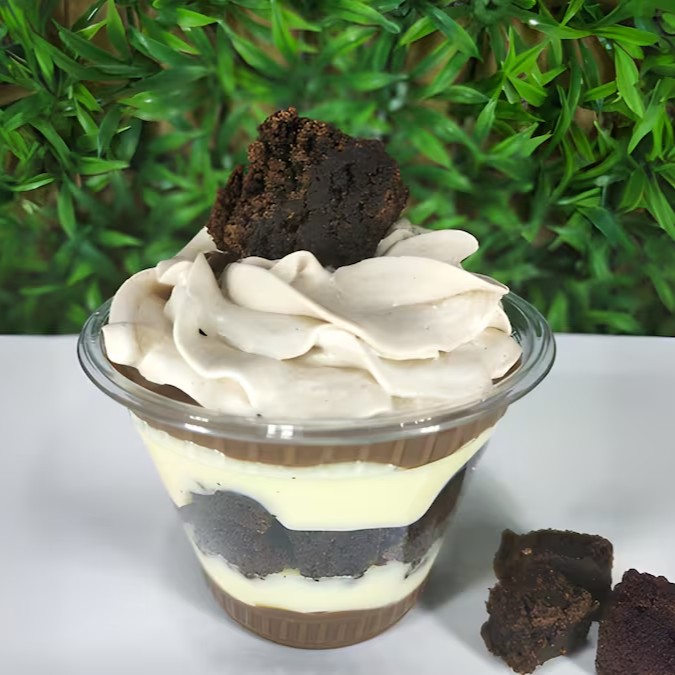 Creme chocolate sabor danette, creme de leite Ninho, pedaços de brownie, decorado com chantily e brownie. Aprox. 250g