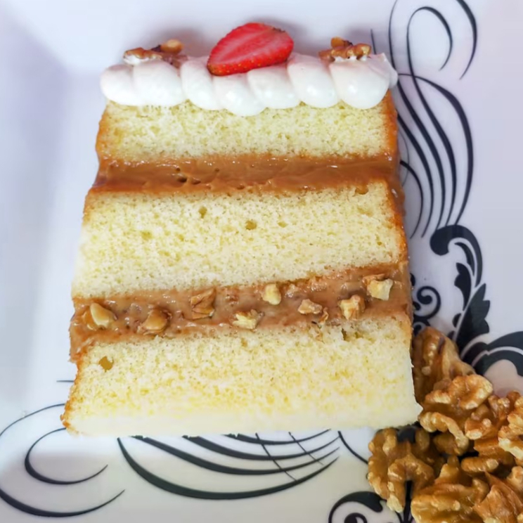 Massa branca super fofinha e úmida na medida certa, com um toque de Ninho. Recheado com uma camada de estrogonofe de nozes e outra com brigadeiro de doce de leite cremoso. Decorado com musse de leite Ninho e pedacinhos de nozes. Aprox. 200g