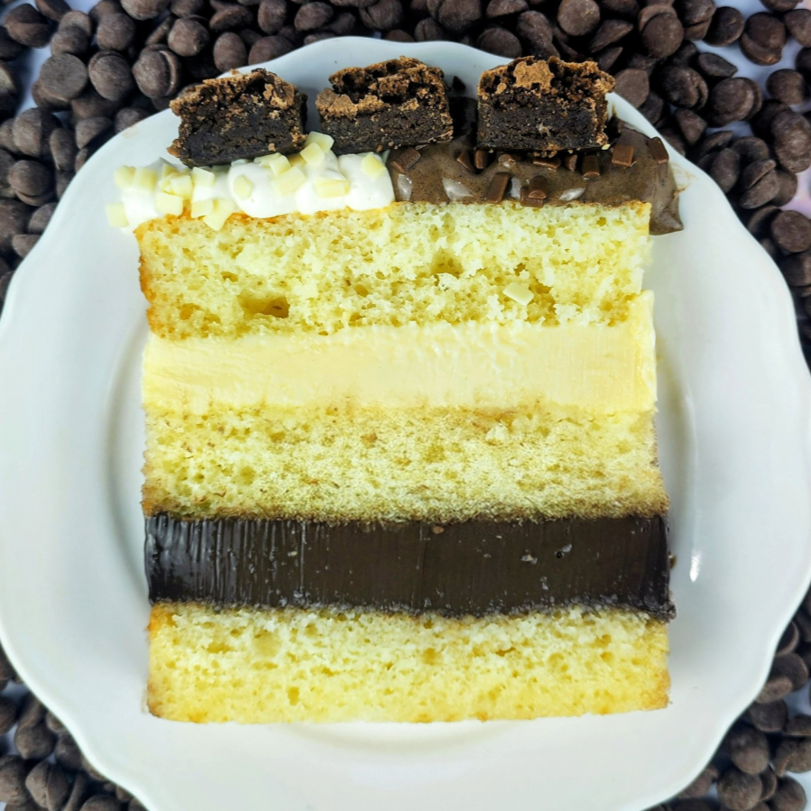 Aprox. 200g. Massa de chocolate 50% cacau, recheado com brigadeiro blend cremoso, coberto com brigadeiro branco cremoso, polvilhado com leite Ninho. Aprox. 200g