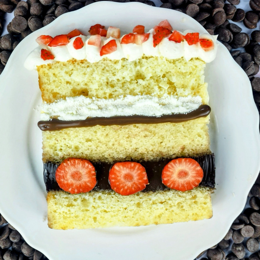 Aprox. 200g. Massa branca feita com iogurte natural, com um toque de leite Ninho. Recheado com uma camada de brigadeiro branco cremoso e brigadeiro blend cremoso, decorado com morangos frescos, creme de avelã, leite Ninho em pó e musse de leite Ninho.