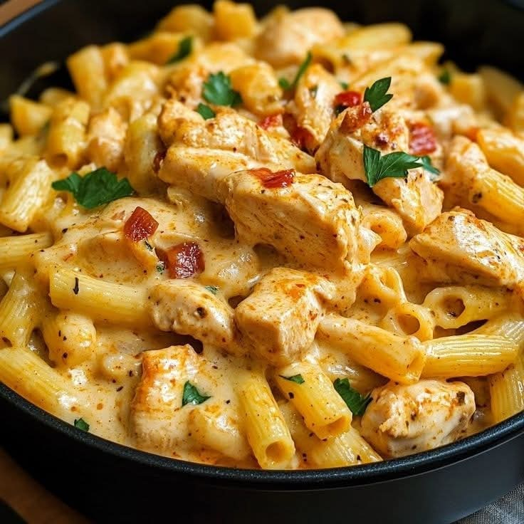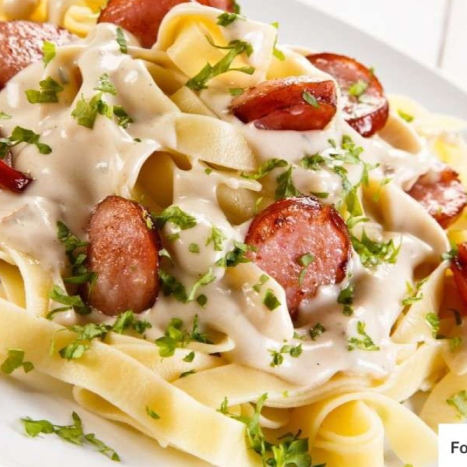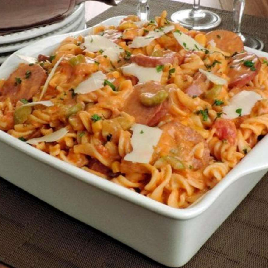 Um delicioso prato , escolha sua massa e sinta a experiência de uma refeição suculenta e cheia de sabor , frango selado no azeite, molho branco, queijo mussarela, cubos de presunto, ervilhas , finalizado com creme de requeijão, cebolinha e bacon crocante.