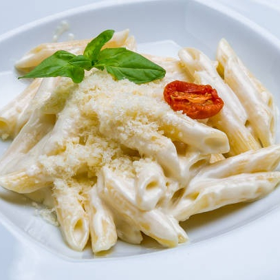 Penne rigate, molho bechamel, peito de frango desfiado, cebolinha, parmesão ralado, nóz moscada