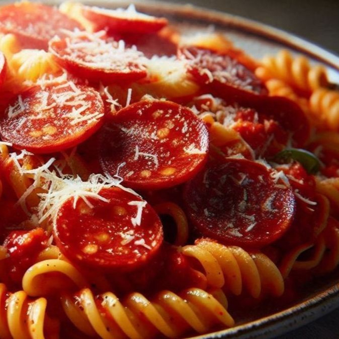 Fusile de semola com ovos, molho de tomate pomodoro natural, linguiça calabresa, cebola em rondelas, cebolinha picada.