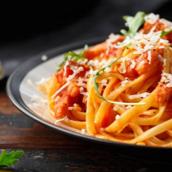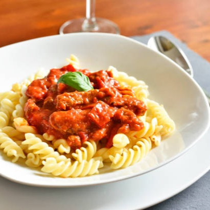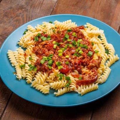 Fusille de Grano Duro, carne moida selecionada, molho pomodoro, cebolinha, parmesão ralado